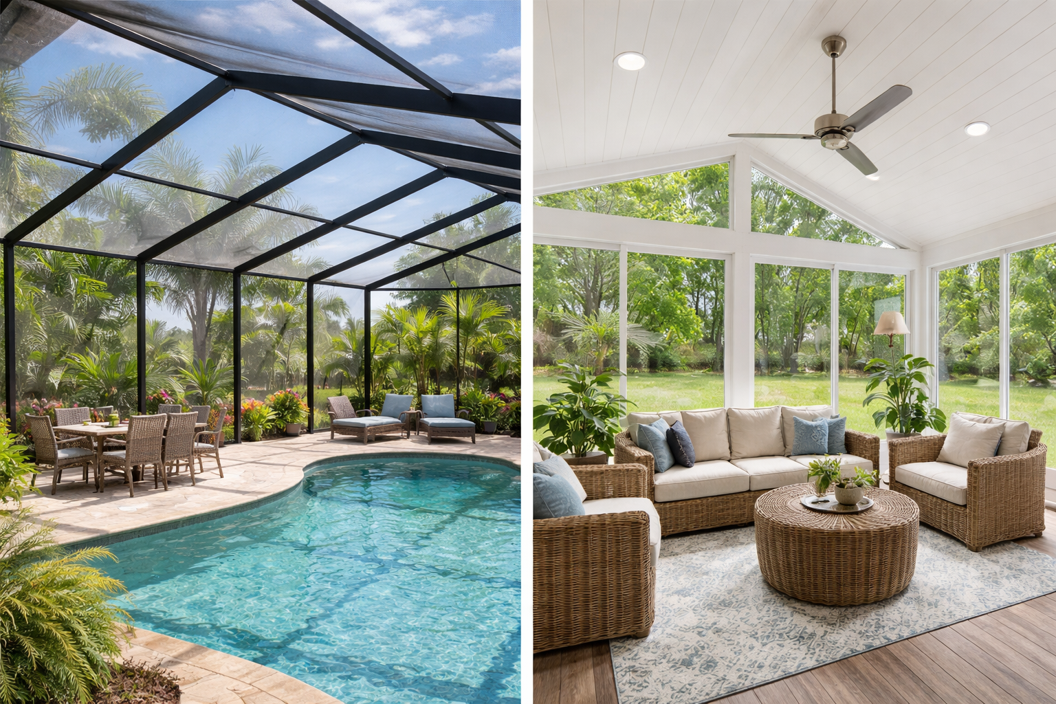 Screen enclosures use lightweight frames and mesh screens. Sunrooms use glass, insulated walls, and solid roofing materials. This difference impacts cost, durability, and comfort.